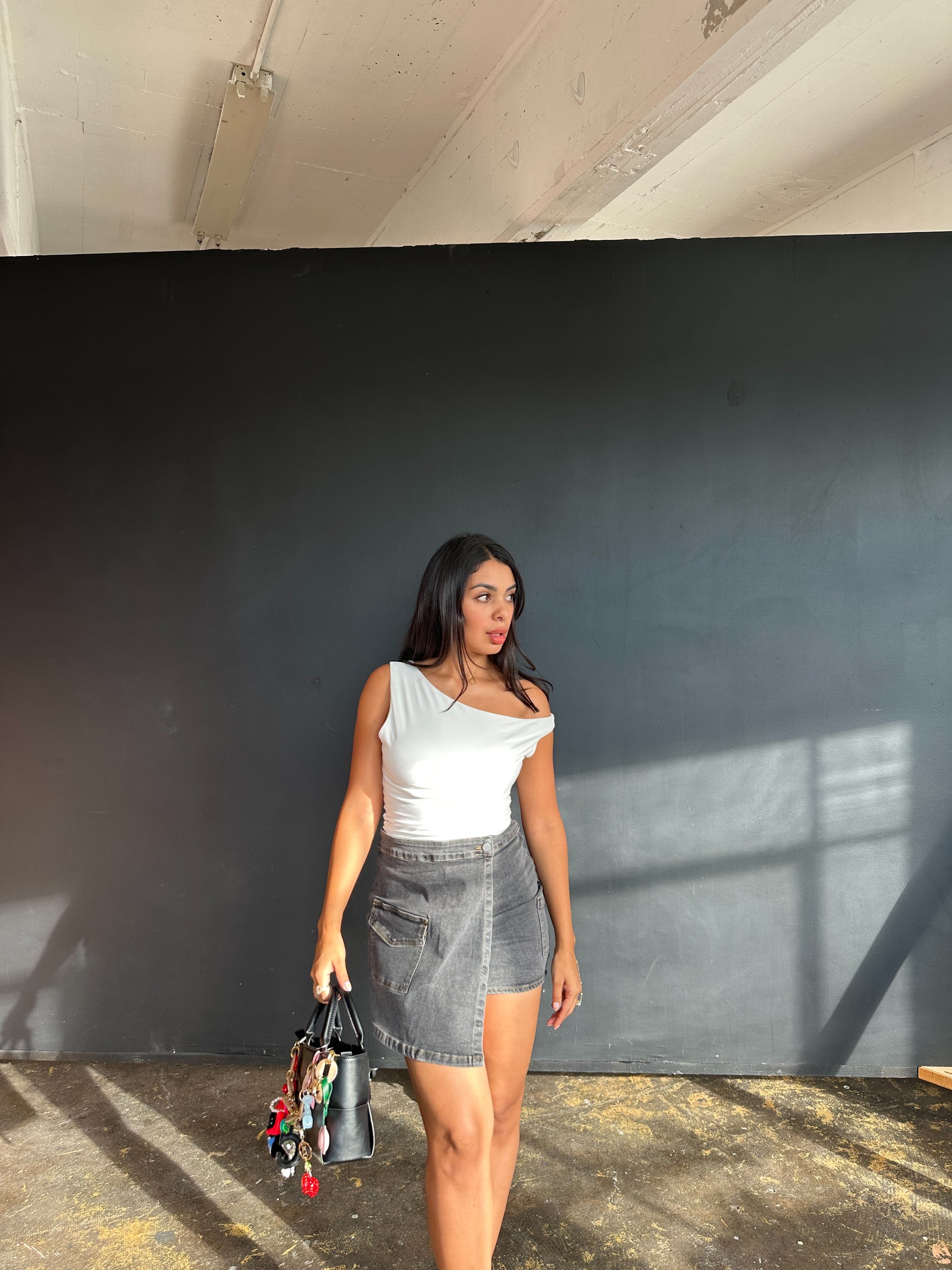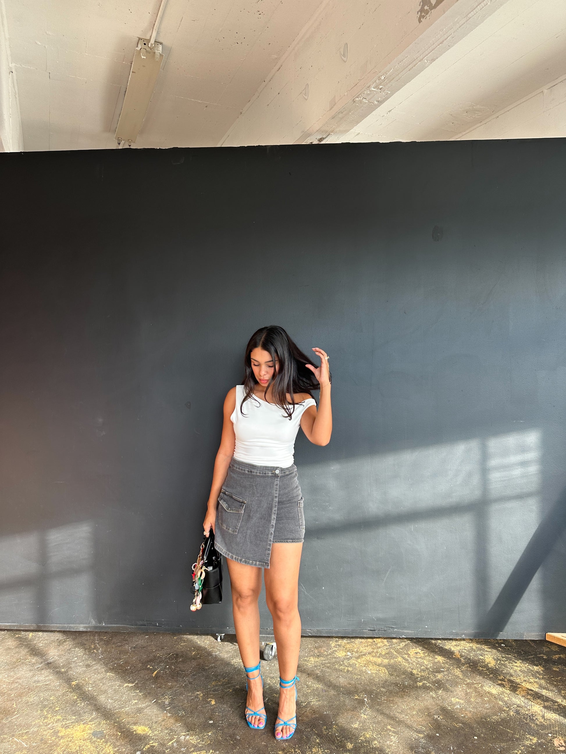 Denim cargo mini wrap skirt