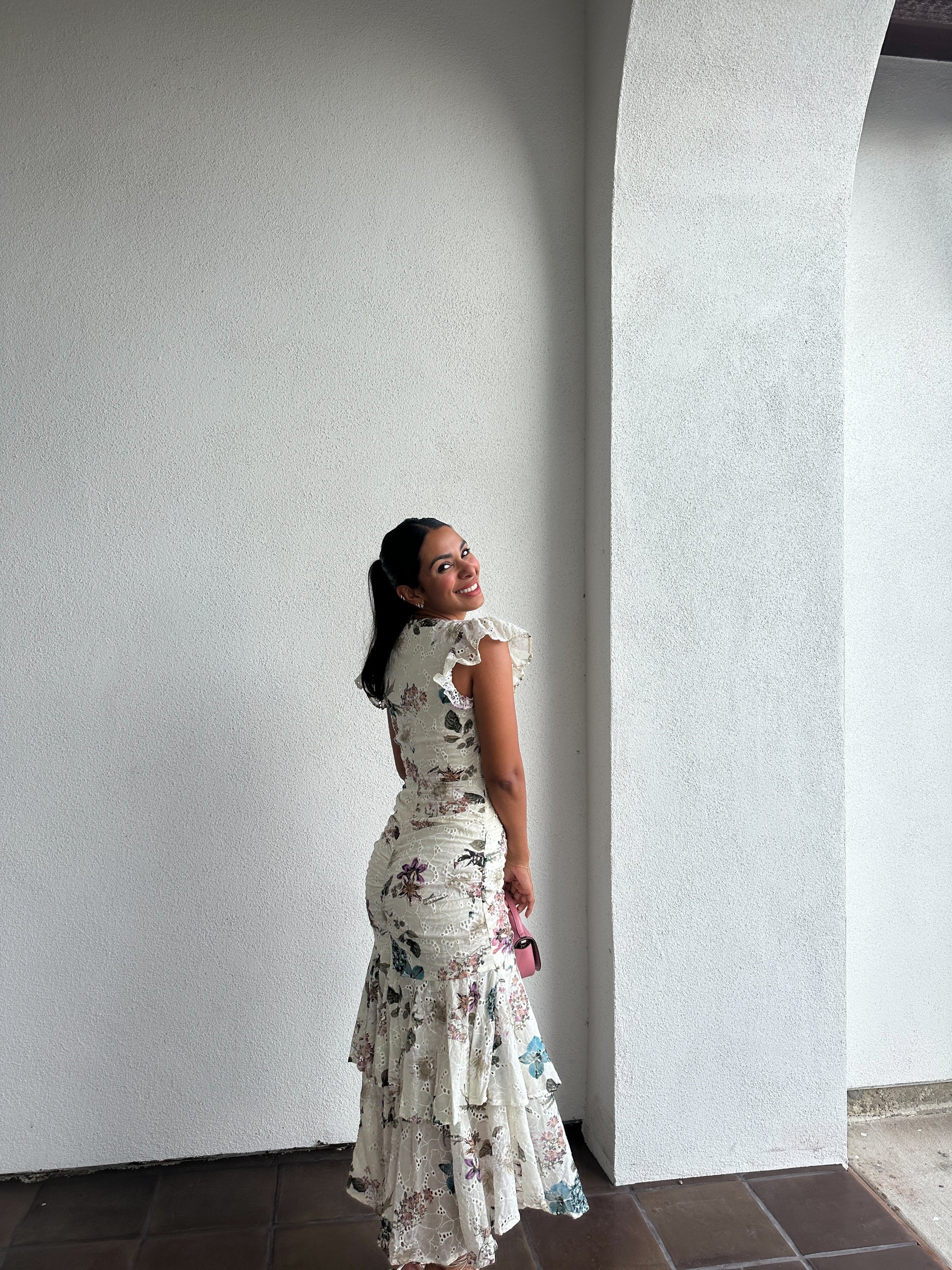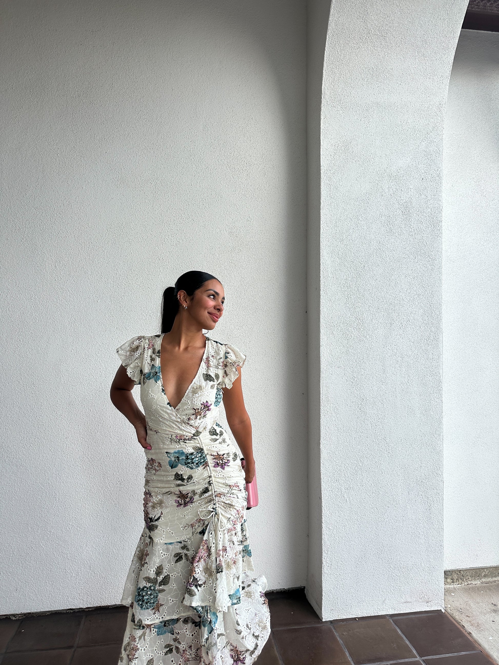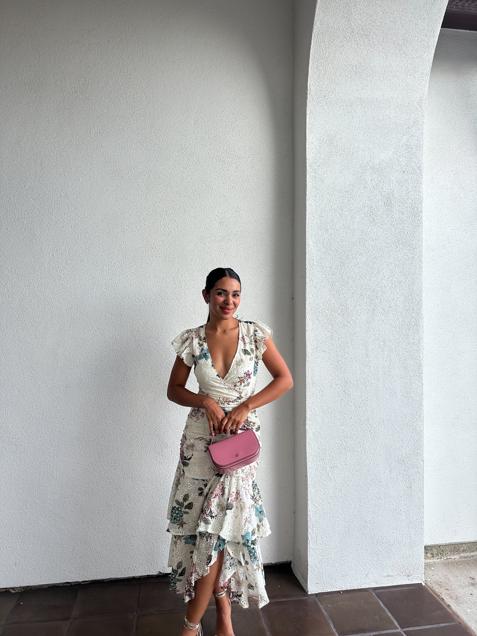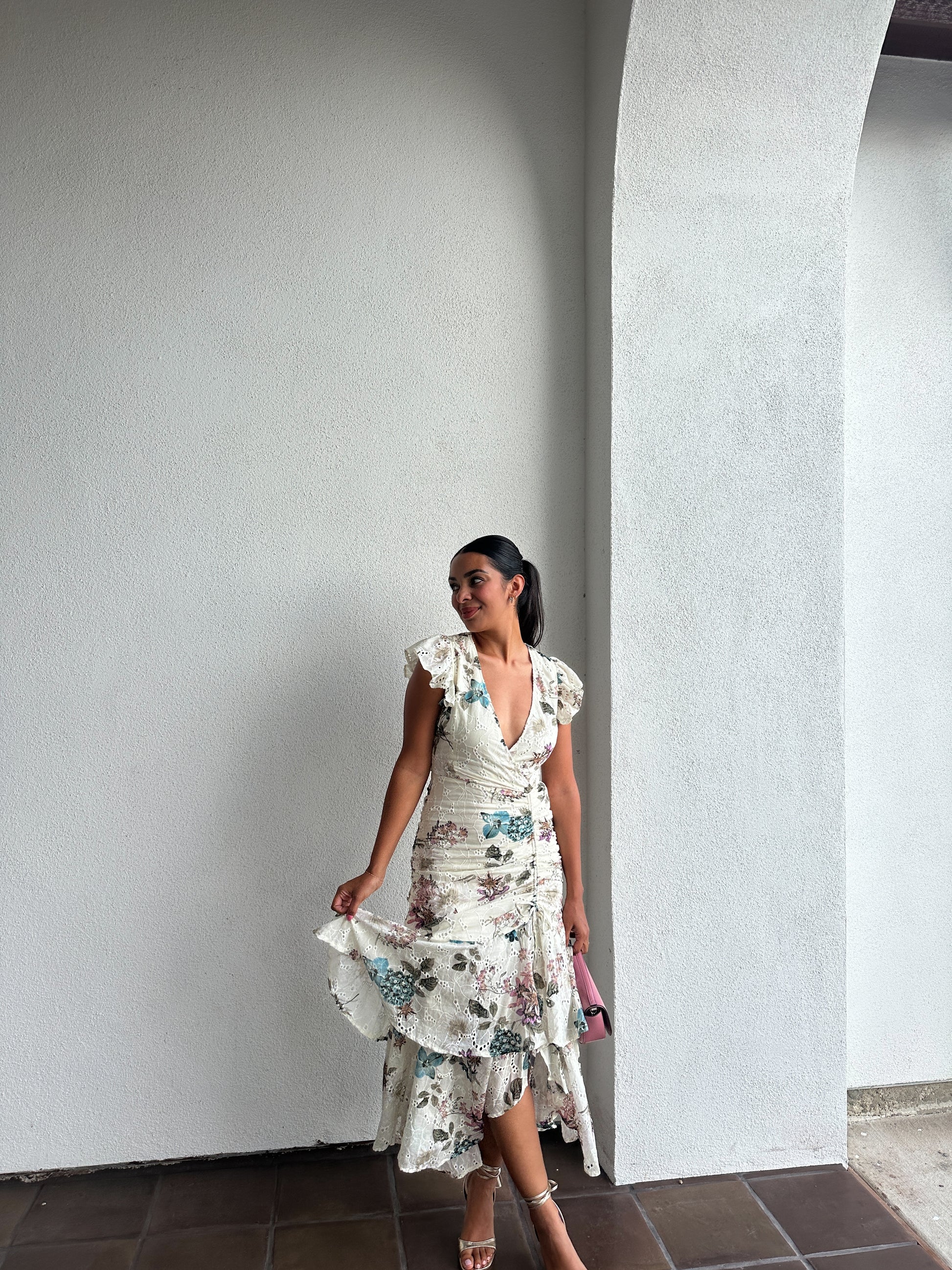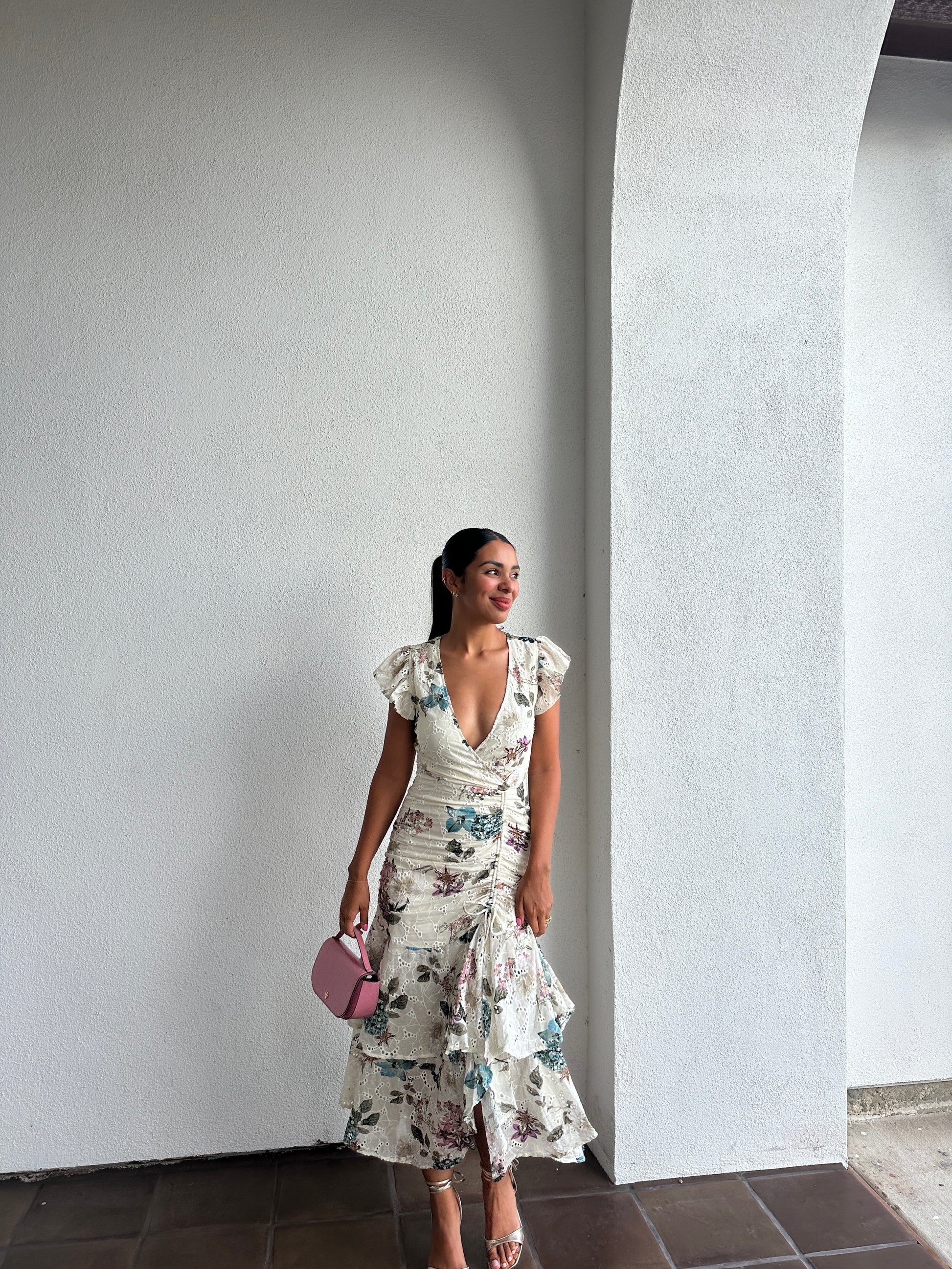 Floral print dress with v neck, shirring details, and adjustable strap.